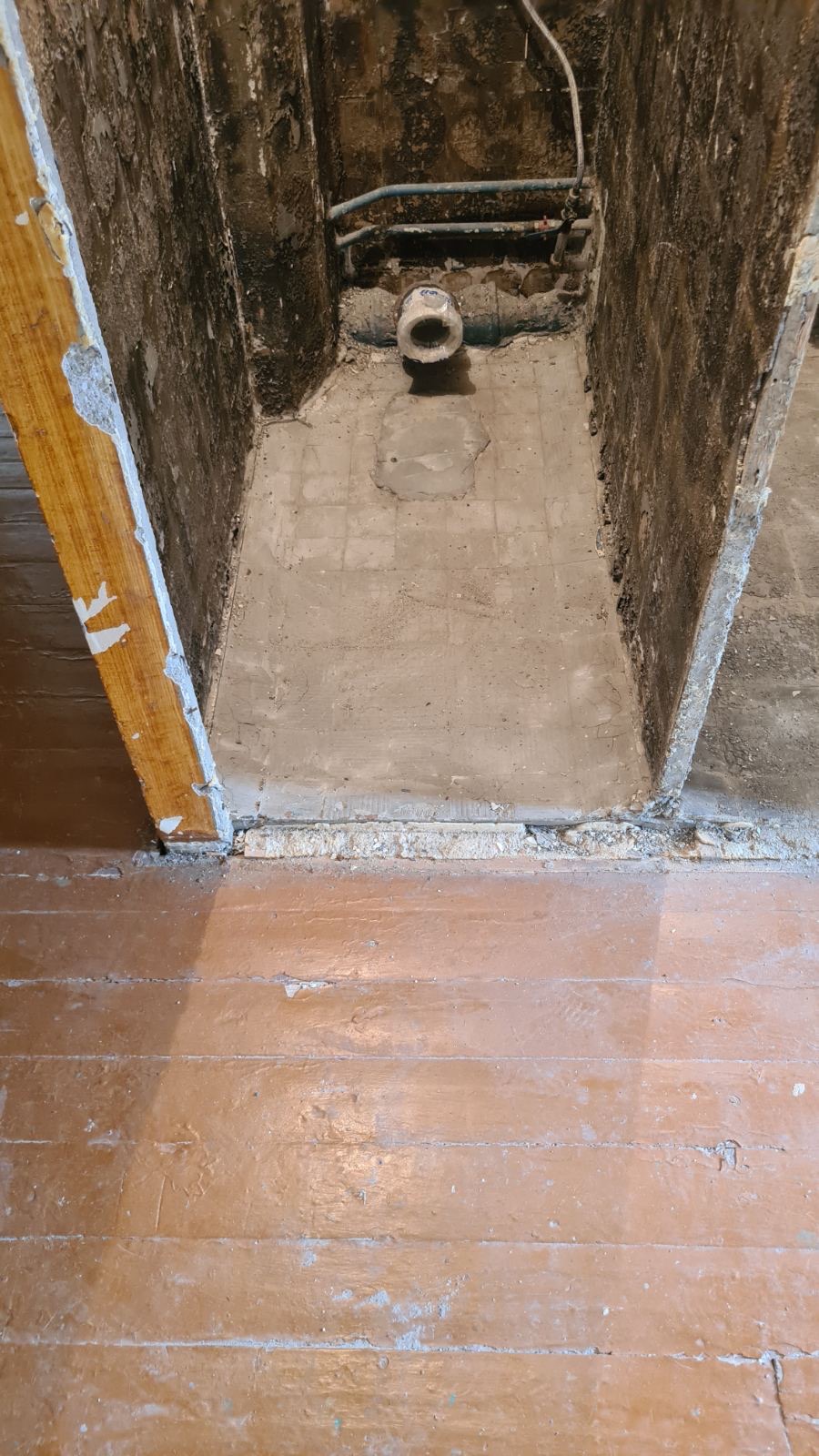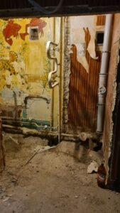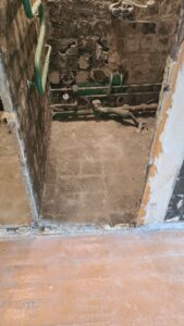 Santechnika: Vonių, unitazų, maišytuvų nuėmimas, senų vamzdžių pjovimas ir laikinų aklinių pastatymas.